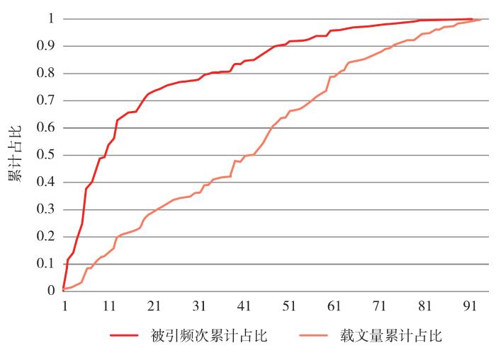 JCI从研究主题、出版类型、出版年份3个方面对文章的影响力进行统一计算。图4为近5年期刊的JCI,2021年IF变异系数达到了1.60,而同年JCI变异系数仅0.97,不过相较往年JCI的变异系数(在0.74到0.81之间)仍有提升。对相邻年份的JCI进行差异性分析,结果显示仅2021年和2020年间有显著性差异,而与IF不同的是,2021年JCI显著低于2020年。这是因为JCI是期刊发表文献的平均CNCI,其使用同年同领域文献被引频次均值对单篇文献被引频次进行标准化,同年同领域内所有期刊的平均JCI应该接近于1,这意味着,当有期刊JCI上升时,相应也会有同领域期刊JCI下降。前文提到传染病学领域论文在2020年的被引频次大幅提升,不过引文指标多呈现偏态分布,一方面少量文献获得较高被引拉高了平均被引水平,另一方面,少数主体(如学者、机构、期刊等)获得的引用占同领域内所有引用的绝大多数。图5显示了按照2021年IF排名下的期刊2020年累积被引频次占比和载文量占比,可以看出载文量分布较为均匀,而被引频次分布极不均匀。前10名的期刊获得了总被引的49%,前20名期刊获得了总被引的72%,少数文章获得了绝大多数被引,而这些文章集中在排名靠前的期刊上。这也造成了少数期刊JCI上升,大部分期刊JCI下降。结合2021年JCI变异系数相对以前有所提升来看,说明文献引用集中度有所提升,不过总体而言,JCI受到的影响较IF而言更小。