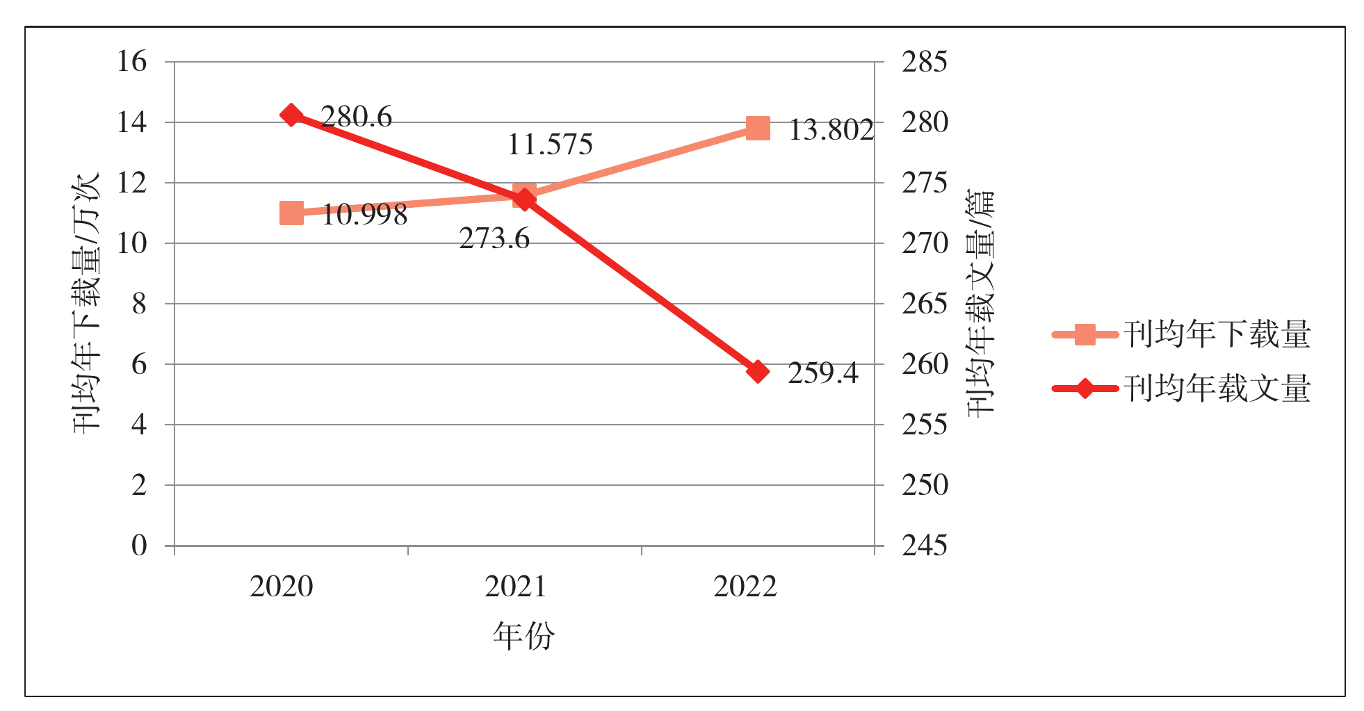 2020—2022年我国中文科技期刊的刊均年载文量、刊均年下载量