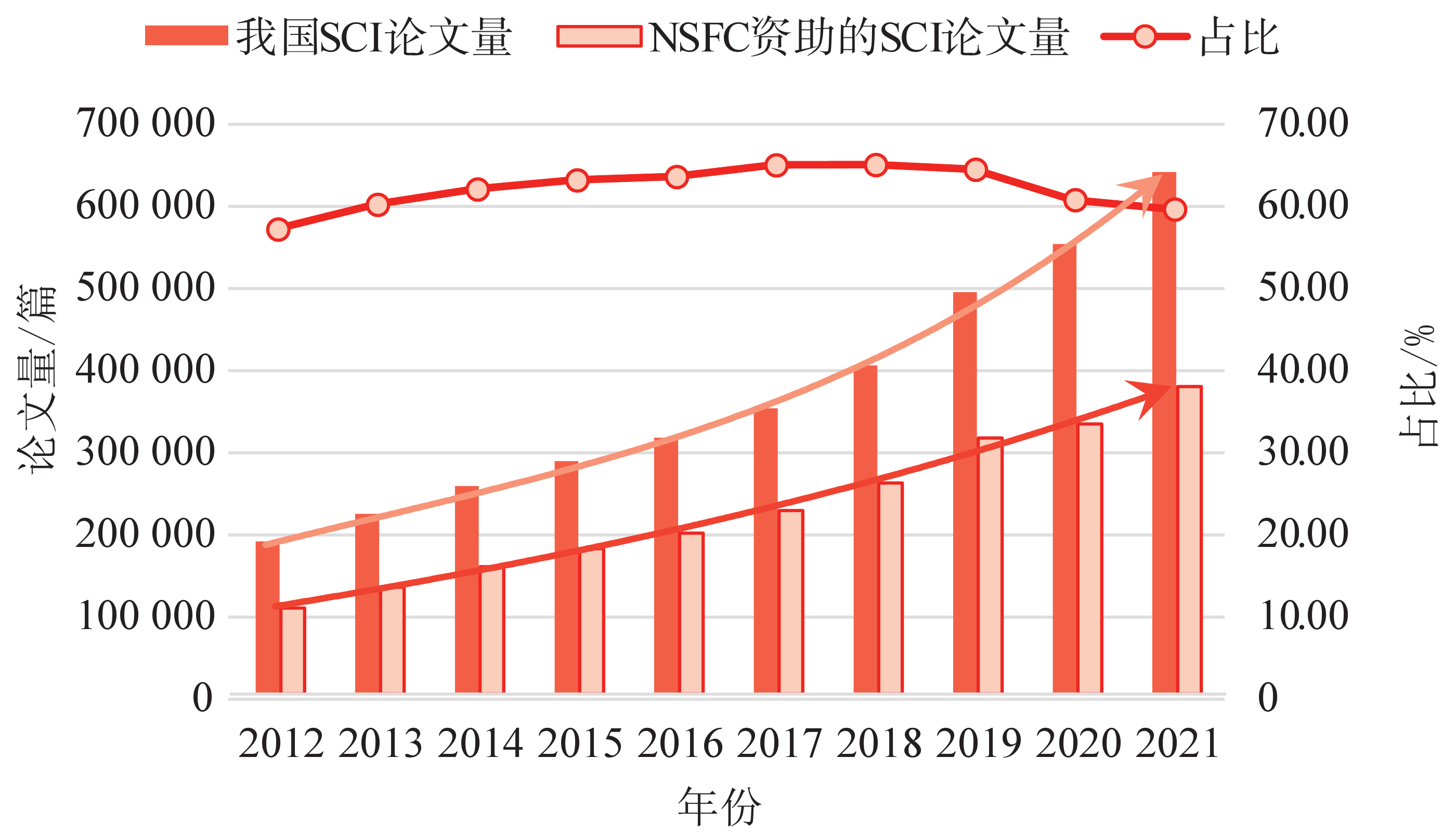 2012—2021年NSFC资助的SCI论文量及占比