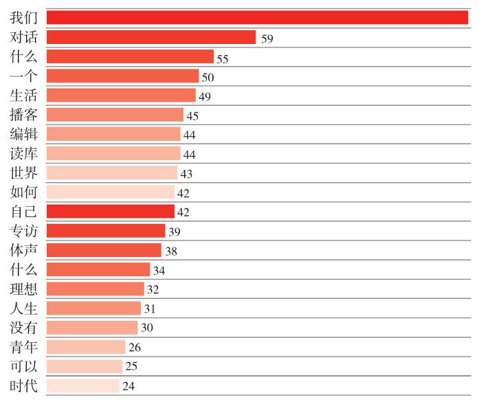 鉴于书业播客中泛文化类书业播客占比较大,共19档,约占59.4%,如表1所示,且泛文化类播客极具代表性,因此对书业博客议题的分析,将基于19档泛文化类书业播客节目进行。在主流音频平台爬取播客标题,经过清洗后整理出1 375条有效播客标题数据,生成了词云图,如图3所示,试图从中分析当下书业播客的议题倾向。通过高频词统计,如图4所示,“生活”“编辑”“世界”是书业播客标题最青睐的3个词汇,分别出现49次、44次和43次。书业播客作为数字出版新业态,议题自然离不开图书编辑与出版。例如,明室推出的播客“有关紧要”制作了多期与“出版经验”“图书营销”“女性图书”“文字编辑”等关键词有关的节目,从编辑的角度聊出版业的业态流变。当然,书业播客在议题选择上并不局限于图书和出版业相关文化内容,大部分节目也将目光放在大众关心的社会议题上。例如,单读出品的播客“螺丝在拧紧”,从公共关切的议题切入,与业内人士展开对话,以独立的洞察输出锋利的观点。2023年7月27日,“螺丝在拧紧”更新节目“对话林小英:教育精英化,谁是淘汰者?”,聚焦教育议题,主播与北京大学教育学院副教授林小英一起探讨普惠教育的理想图景,以及社会教育问题所在,在喜马拉雅平台上收获了17.4万的播放量。又如,看理想制作的“八分”节目从热点话题出发,借助播客平台的媒介可供性在云端构建起公共讨论的地带,重新审视文化现象和社会趋势。“八分”在小宇宙平台的订阅量为39万,每期节目的收听量在百万次上下波动。2023年5月5日,“八分”发布播客节目“成庆×梁文道:如何安顿个体化的生命?”,分析年轻人喜欢去寺庙烧香这一现象,由此引入对当代个体化生命如何安顿的思考,斩获近百万次播放量。该议题涉及的关键词与词云图中的“青年”“时代”和“人生”等高频关键词相对应。可见,对于青年群体动态的捕捉,对其当下困境的解读和未来发展的关注,是大多数书业播客的着眼点。此外,部分主播以出版编辑或媒体工作者的专业素养关注时代病灶,直击社会痛点。例如,活字文化编辑部出品的“活字电波”从一众泛文化类播客突围而出,用时代性目光观照社会生活现实。议题围绕“世界”“编辑”“自己”“历史”等关键词,在政治类话题领域开疆扩土,制作出“真相、阴谋论及其他——美国国家级谋杀的破案始末”等节目,揭开迷雾深处美国当时真实的社会样貌。
