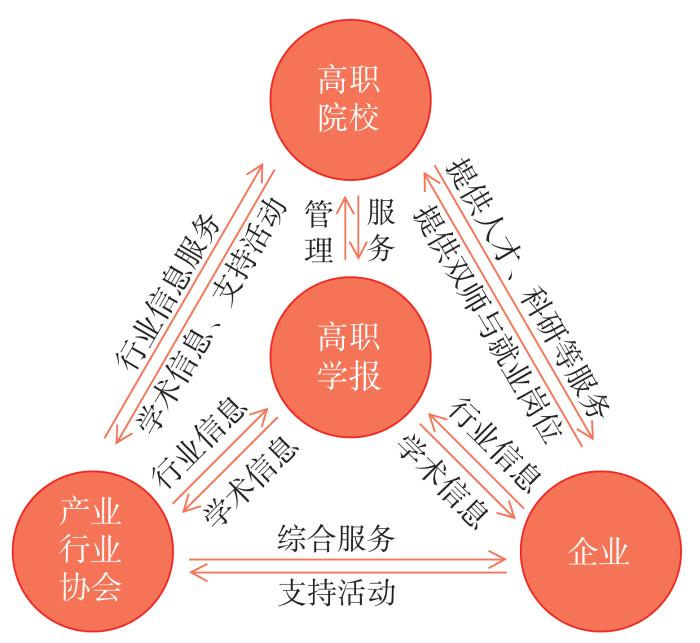 由图2可知,高职院校受政府管理,同时管理学报,学报积极为高职院校提供相关服务;学报从产业行业协会、企业获取行业信息,并向他们提供学术信息;高职院校为企业提供人才和科研服务,企业为高职院校提供双师型教师,以及学生学习、就业的岗位;高职院校可从产业行业协会获取相关的行业信息,又可为其提供学术信息,支持其开展相关活动;产业行业协会为企业提供各种综合服务,企业则积极参加其活动。