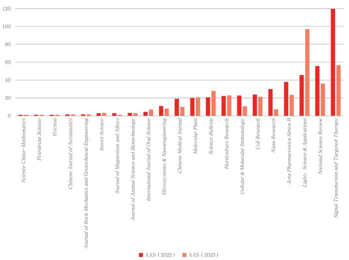 如图1所示,2022年,各期刊AAS均值为23.34,最高的为《信号转导与靶向治疗》(162.13);2023年,各期刊AAS均值为17.21,最高的为《光:科学与应用》(97.04)。两年最低的均为《中国科学:数学(英文版)》(1.00),这和学科性质相关。