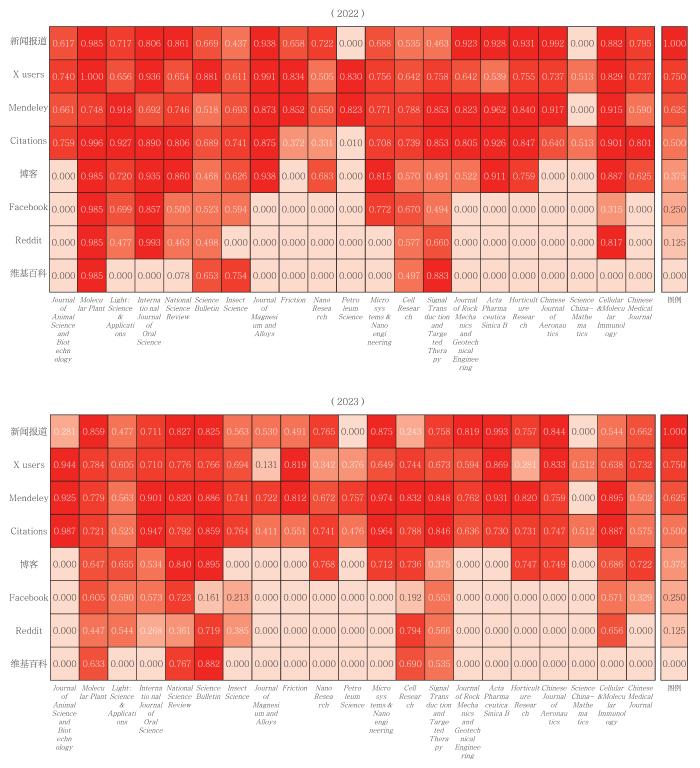 2022—2023年领军期刊TOP100论文的传播途径指标因子得分如图3所示。由热力图可知新闻报道、X users、Mendeley、Citations为领军期刊中的优势传播途径。