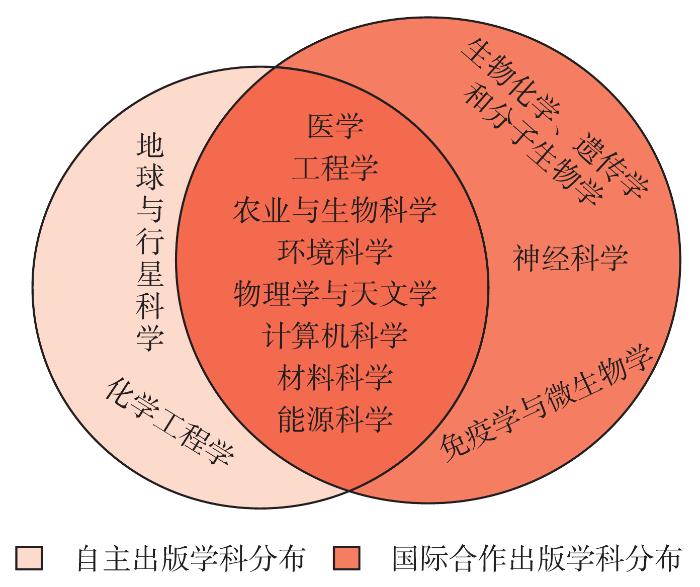 新收录的英文科技期刊共涉及13个一级学科,中国期刊自主出版和国际合作出版期刊侧重学科方向略有不同,但在医学、工程学、农业与生物科学、环境科学、物理学与天文学、计算机科学、材料科学、能源科学8个学科有交叉(见图1)。