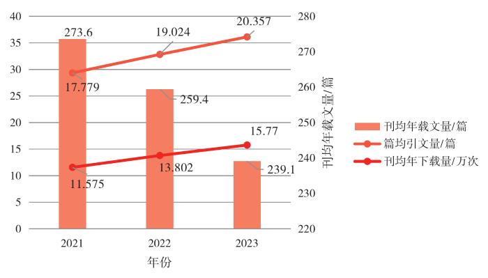 图2给出了2021—2023年我国中文科技期刊的刊均年载文量、刊均年下载量、篇均引文量情况。