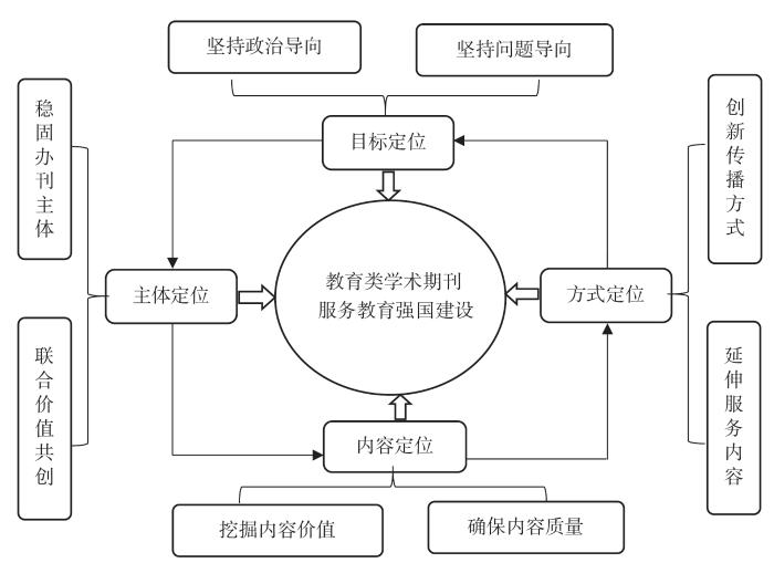 教育类学术期刊的建设与发展与国家教育战略密不可分。在教育强国建设的进程中,教育类学术期刊要承担起政治使命、国家使命、社会使命,这就需要其立足教育领域,积极探索有中国特色的教育理论和实践问题,坚持目标定位、内容定位、主体定位、方式定位,明晰发展空间,形成教育强国建设的中坚力量和坚强保障。教育类学术期刊服务教育强国建设的维度构成如图1所示。