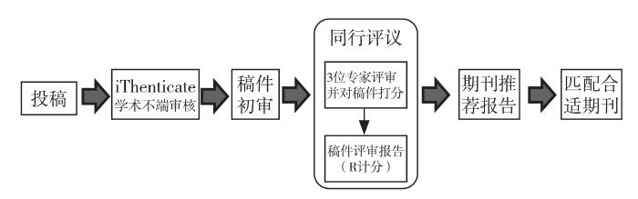 Rubriq是一家独立的提供第三方同行评议服务的公司[6],其任务是为作者创作的论文寻找合适的期刊,缩短论文发表周期,以使研究者将更多的时间投入研究中。Rubriq主要接受免疫学、癌症生物学和微生物学领域的稿件,采用3位专家双盲同行评议的模式。作者可在1~2周内获得详细的评审报告[7],作者需要支付的费用为600美元/篇。Rubriq的全套服务已于2013年上线。其具体的运行机制如图1所示:①用户向Rubriq投稿,系统内iThenticate软件对稿件进行学术不端审核;②工作人员对稿件初审;③通过初审的稿件送3位专家外审,并形成带有定性评价和专家打分的评审报告;④根据评审得分计算稿件综合评分(R值),为稿件推荐合适的期刊;⑤作者根据稿件推荐报告遴选合适的期刊。