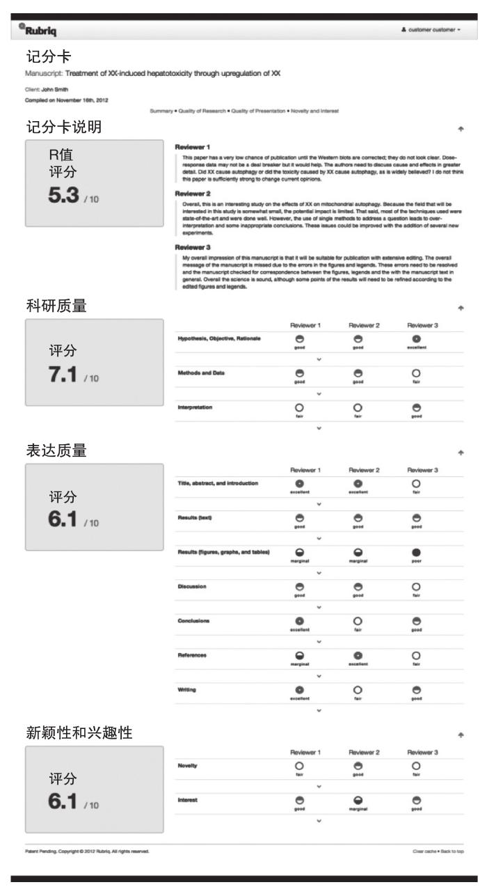 目前,除了Rubriq公司外,Peerage of Science也在同行评审中采用专家打分的方式,由评议专家根据文章的广度、影响、独创性、数据、方法、结论和文献范围等方面对论文在1~5分内进行打分,编辑结合评审意见的评分,计算出论文的最终评分。[10]