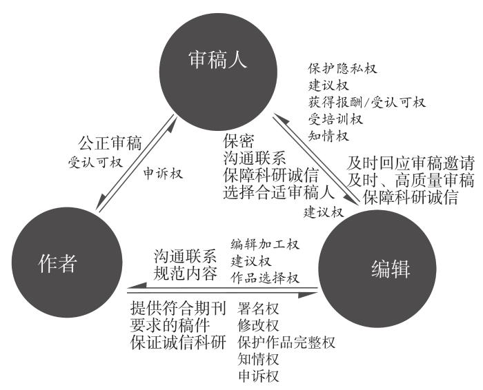 编辑、审稿人和作者是同行评议过程中最重要的参与者,三者各有分工,权利义务也有很大区别。编辑是作者和审稿人之间沟通的“桥梁”,组织、保障同行评议的实施,是学术期刊同行评议中不可或缺的角色。审稿人是学术期刊同行评议中的关键评议角色,他们对论文的评价会很大程度上影响论文是否会被接收。作者的创作是学术期刊存在的根本,为同行评议的发生提供了客体,并对同行评议结果提供反馈。三者在学术期刊同行评议中互相联系、互相依存、互相制约,维系着学术评审过程的正常运转。