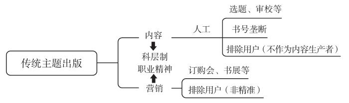 出版作为知识传播的重要载体必然是媒介,而传统的主题出版与数字化的主题出版拥有不同的媒介逻辑。传统主题出版的媒介逻辑大致可以概括为选题策划、选题论证、作者交稿、三审三校、总编审批、申请书号、排版设计、印前审查、印刷销售等。有学者认为“长期以来,落后的生产方式、生产流程和管理方式,导致传统出版流程存在一系列制约、限制甚至阻碍数字出版业务发展的问题”[12],甚至存在传统出版和数字化出版的平行状况。可以看到,传统主题出版有着一套严密的闭环操作流程,有如下特点:其一,人工为主。从选题策划到审校基本上以人工为主、技术为辅。其二,内容生产机构。传统主题出版依托出版机构不断输出内容。其三,非精准销售。通过图书订购会、书展、签售会等形式为书籍造势从而售卖。其四,对用户的拒斥。传统主题出版并没有将用户纳入出版中,而只是将用户看作单一的读者,忽视了用户的参与性创造能力。总体来说,传统主题出版秉持着一套严格的管理制度,在前数字化时代正是通过此类职业精神和操作规范对于出版的渠道、营销方式进行垄断,而面对新媒介带来的新的传播、营销方式难以进行思维的改变,只是将其视作异于传统营销的新渠道,将丰富的用户逻辑、数字媒介的自动化等摒除在外。(见图1)