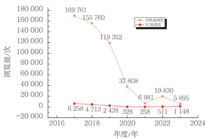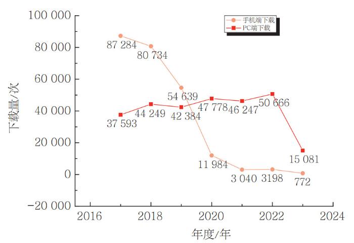 分别统计手机端和PC端2017年至2023年学术论文浏览量和下载量(数据采集时间为2024年1月15日),结果如图 10、图 11所示。由图 10可知,总体上,通过手机端浏览学术论文次数比PC端多,但是手机端浏览次数总量呈下降趋势,且下降幅度较大,而通过PC端浏览次数总量较平稳。由图 11可知,通过手机端下载学术论文次数总量呈下降趋势,且下降幅度较大,而通过PC端下载较平稳(2023年除外,可能是由于采集时间是2024年年初,采集时间与学术论文发表时间间隔太短);2019年前(包括2019年)通过手机端比通过PC端下载次数多,2020年以后(包括2020年)则反之。结合图 10和图 11可知,通过手机端浏览和下载学术论文逐年呈下降趋势,但是手机端浏览量总体大于PC端,2020年后(包括2020年)手机端下载量低于PC端下载量,说明用户用微信公众号下载学术论文热度降低,倾向于通过手机端快速浏览,通过PC端精读。