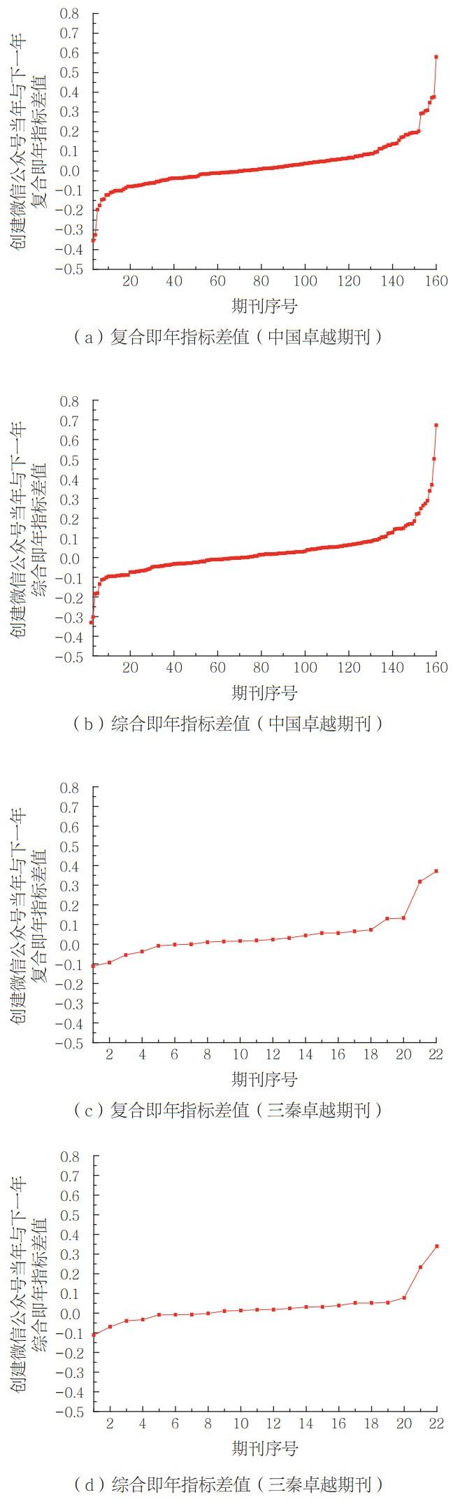 综上,说明统计周期为创建微信公众号前后各1年,对期刊影响因子和网络传播指标有影响的其他因素基本没有变化的条件下,创建微信公众号能够促进影响因子指标和网络传播指标提升,且提升网络传播指标更显著。