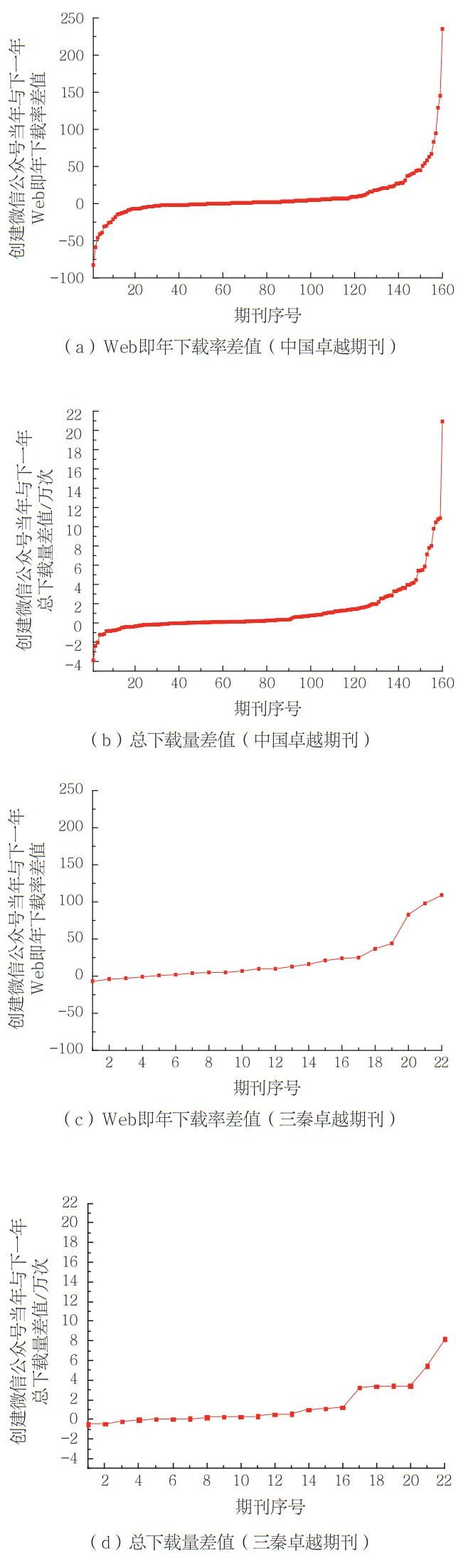 将卓越期刊创建微信公众号下一年度网络传播指标与创建微信公众号当年指标差值由小到大排序,结果如图 6所示,可以看出,差值为正的最大绝对值远大于差值为负的最大绝对值。