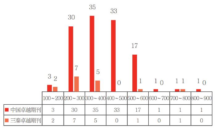 卓越期刊微信公众号WCI数值分布如图 8所示。可以看出,56.2%的中国卓越期刊和87.5%的三秦卓越期刊WCI数值集中在400以下,说明大多数卓越期刊微信公众号的影响力较小,在建设运营方面还需要做调整。
