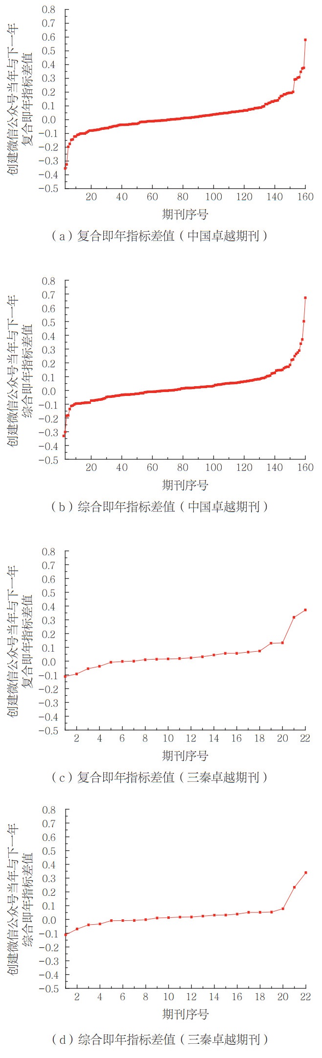 影响因子指标差值(创建微信公众号后一年数值减创建微信公众号当年数值)