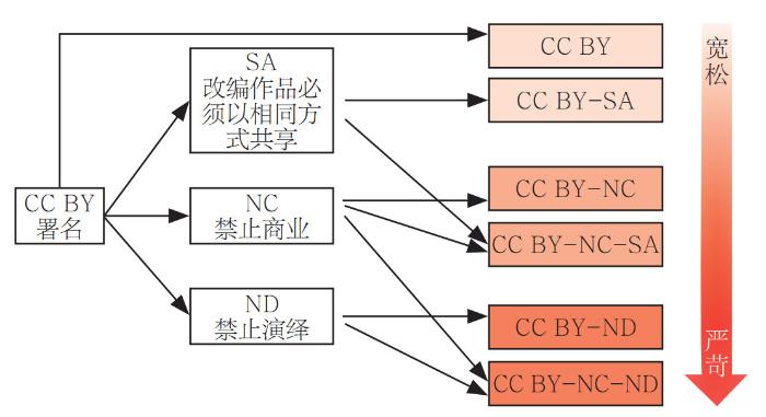 CC协议以四个要素为基础,即署名(BY)、以相同方式共享(SA)、非商业使用(NC)和禁止演绎(ND),组合形成六种不同的协议类型:①CC BY:只要对原作者署名,他人可以任何目的、任何形式使用作品;②CC BY-SA:与①类似,但额外加一个条件,即基于原作品的改编作品也必须以CC BY-SA的方式发布;③CC BY-NC:他人可以任意使用作品,只要不是出于商业目的,只要对原作者进行署名;④CC BY-NC-SA:与③类似,但额外加一个条件,即基于原作品的改编作品也必须以CC BY-NC-SA的方式发布;⑤CC BY-ND:允许他人以任何目的分享和传播作品,只要不对原作品进行改编,只要对原作者署名;⑥CC BY-NC-ND:他人可以任意使用作品,只要不用于商业目的,只要不对原作品进行改编,只要对原作者署名。以相同方式共享(SA)和禁止演绎(ND)是互相排斥的两个要素,因为相同方式共享指的是对改编作品的共享,禁止演绎也就不存在改编的情况,因此不存在SA和ND的组合。图 1呈现了CC协议六种不同类型的组合形式,其开放程度自上而下依次减弱。此外,CC协议还有一种特殊的类型CC0,指彻底放弃版权而将作品完全置于公共领域,允许他人以任何形式出于任何目的对其进行使用并且不需要标明作者归属。