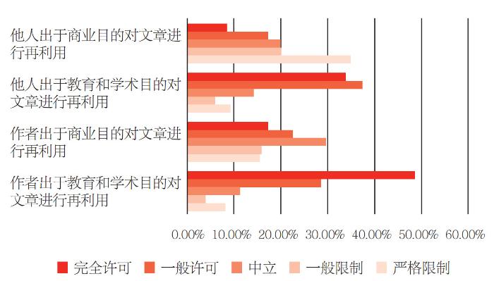 涉及文章的再利用时,整体上讲,作者对出于教育和学术目的的使用持宽容态度,对出于商业目的的使用则持谨慎态度。如图 3所示,接近50%的受调查者认为,当作者出于教育和学术目的对文章再利用时,应当给予完全的许可;对于他人出于教育和学术目的对文章再利用时,34%的受调查者认为应给予完全许可,37%的人认为应给予一般许可,总体上讲态度偏向宽容。但作者对于文章出于商业目的的使用持谨慎态度,接近35%的作者认为对于他人出于商业目的对文章进行再利用要严格限制,就算是作者自身出于商业目的对文章再利用也有相当保守的态度,认为完全许可或者一般许可的作者总计不超40%。