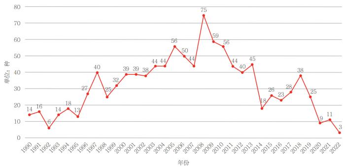 根据巴西国家图书馆官网的统计数据,1990—2022年,在巴西共出版了1068种中国主题图书,年均出版量为33种。对于出版年份不确定的书籍(共9种),将其统计在出版总量中,但在年度数量统计中略去不计。从出版数量的年度分布折线图来看(图 1),这30年间,中国主题图书的出版数量在巴西图书市场表现出明显的波动趋势,经历了波动上升到波动下降的阶段。为更好地说明每个时间段的出版特点与影响因素,将这30年划分为3个10年区间,并对每个时期的出版情况进行深入分析。