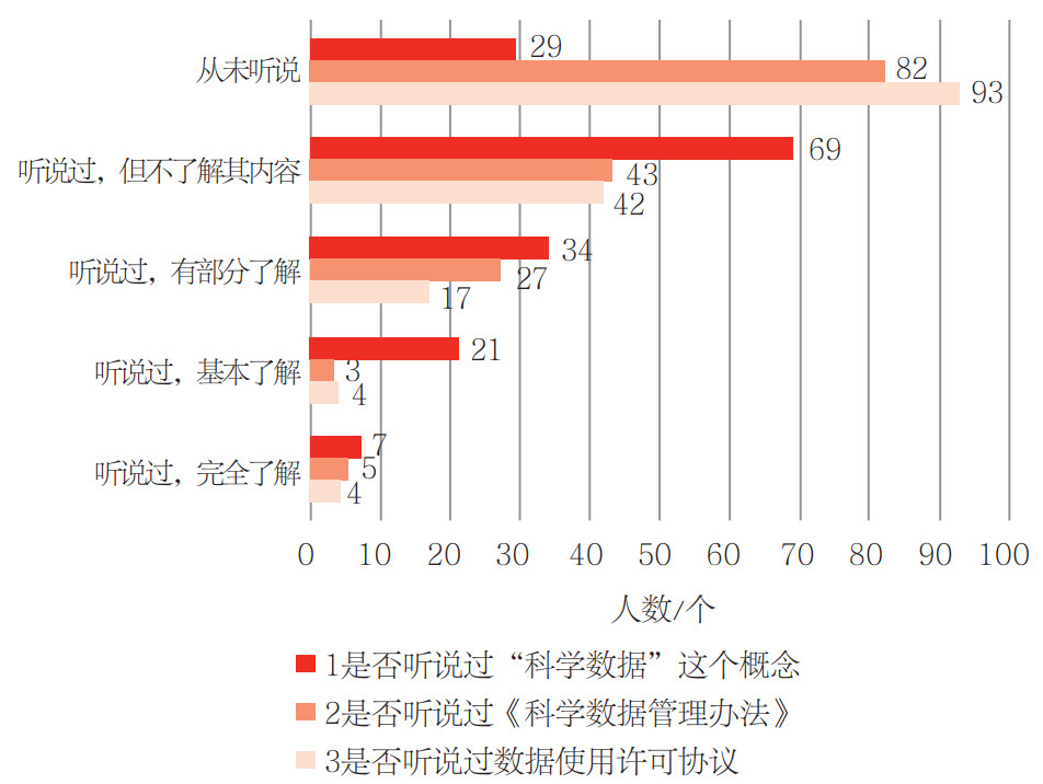 | 图 1 研究者对科学数据相关概念与规则的认知了解现状 注:研究工作组对问题回答选项的设计遵循李克特五级分类,但对每一个问题选项的具体设置并不完全相同,并对选项里什么是“基本了解”“完全了解”进行了部分说明,便于被调查者选择,避免错分偏倚。例如,问题3,询问研究者是否听说过数据使用许可协议,研究工作组在设置问题时便对什么是数据使用许可协议进行了举例,而且规定基本了解指的是了解CC、BY、NC、ND等的具体含义,完全了解指的是了解不同数据使用许可协议之间开放程度的区别等。 |