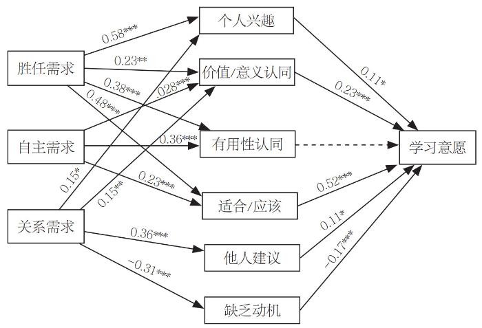 结果显示,培养对象的6种学习动机,除对编辑出版学有用性的认同外,其余5种,也即学习兴趣(β = 0.11,p < 0.05)、对编辑出版学价值的认同(β = 0.23,p < 0.001)、适合/应该学习(β = 0.52,p < 0.001)、外部建议学习(β = 0.11,p < 0.05)以及缺乏动机(β = -0.17,p < 0.001),与学习意愿存在显著性的关系。而三种基本心理需求,即胜任需求(β = 0.362,p < 0.01;95% CI= [0.264,0.496])、自主需求(β = 0.181,p < 0.01;95% CI= [0.086,0.265])以及关系需求(β = 0.142,p < 0.01;95% CI= [0.096,0.218]),对于专业学习意愿具有显著的间接效应。