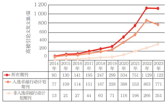 高质量学术期刊对于国家科技创新和科技自立自强发挥着承前启后、举足轻重的作用。[4]近10年来,我国对期刊的政策引导和扶持力度不断加大。从2013年至2018年,国家实施了“中国科技期刊国际影响力提升计划”,培育了一批高影响力老刊,创办了一批高质量新刊。2019年8月5日,中国科协、中宣部、教育部、科技部联合印发《关于深化改革 培育世界一流科技期刊的意见》(以下简称“《意见》”)[5],为我国期刊高质量发展指明了方向。为了落实《意见》精神,2019年9月,中国科协、财政部、教育部、科技部、国家新闻出版署、中国科学院、中国工程院七部门联合下发通知,正式启动实施“中国科技期刊卓越行动计划”(以下简称“卓越行动计划”),周期5年。[6]该项目旨在遴选出一批优秀科技期刊,资助入选期刊提升国际影响力,建设成为世界一流科技期刊。[7] 2021年6月,由中共中央宣传部、教育部、科技部联合印发《关于推动学术期刊繁荣发展的意见》,提出要引导重大原创性科研成果更多地发表在我国本土的期刊上,推进集群化建设,并且强调要构建具有中国特色的学术期刊评价体系。[8]本研究从高被引论文角度切入,通过分析中国大陆SCI期刊2014—2023年发表的高被引论文情况,探索中国大陆SCI期刊影响力10年的变化;对“卓越行动计划”入选期刊发表的高被引论文情况进行分析,对比非入选期刊,分析实施“卓越行动计划”对期刊的影响,进而对我国期刊的发展提供建议,以期为我国建设世界一流期刊提供思路和参考。