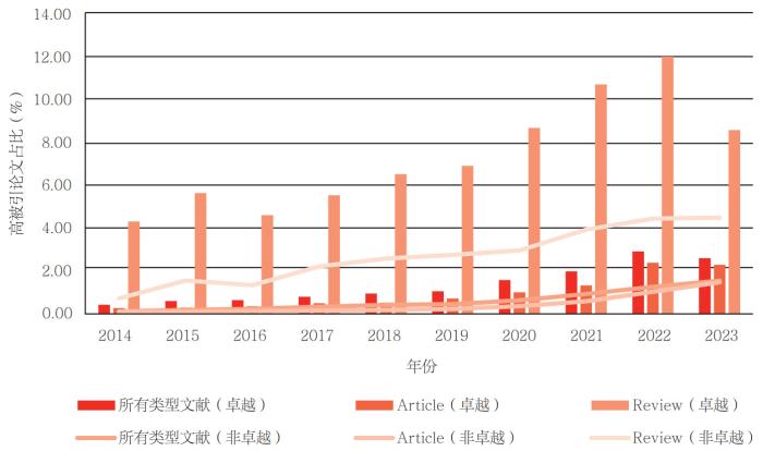 从发文量来看,2014—2022年高被引论文发文量占期刊发文量的比重逐年增长,2023年稍有下降,如表 1所示。从文献类型Article发文量来看,2014—2023年高被引论文占比逐年增长。从文献类型Review发文量来看,2014—2022年高被引论文占比呈现波动式增长,但2023年下降明显。2014—2023年,文献类型为Review的高被引论文占比明显高于文献类型为Article的高被引论文占比。“卓越行动计划”入选期刊与非入选期刊的高被引论文占比如图 4所示。2014—2023年“卓越行动计划”入选期刊的Review高被引论文占比最高,其次是“卓越行动计划”非入选期刊的Review高被引论文占比,说明高水平的Review会吸引更多的关注,对提升期刊的被引频次和影响力有重要的作用。同样,“卓越行动计划”入选期刊的所有类型文献(Article和Review)数和Article高被引论文占比均高于非入选期刊。