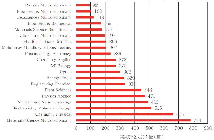 纳入的高被引论文涉及Web of Science学科120个,覆盖47%的WOS学科(WOS学科总数254)。其中,高被引论文数量超过100篇的学科有19个,发文量最多的前20个学科如图 5所示。排名前三的学科分别为Materials Science Multidisciplinary、Chemistry Physical和Biochemistry Molecular Biology,发文量分别为784篇、665篇和515篇。