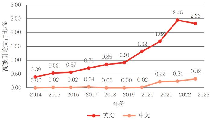 纳入的279种期刊,其中261种期刊语种为英语,17种期刊语种为中文,1种期刊为中文/英文双语种。中、英文期刊的高被引论文占比如图 6所示。2014—2023年,英文期刊的高被引论文占比高于中文期刊。2014—2022年英文期刊高被引论文占比逐年增加,但2023年有所下降。2021—2023年中文期刊高被引论文占比有所增长。