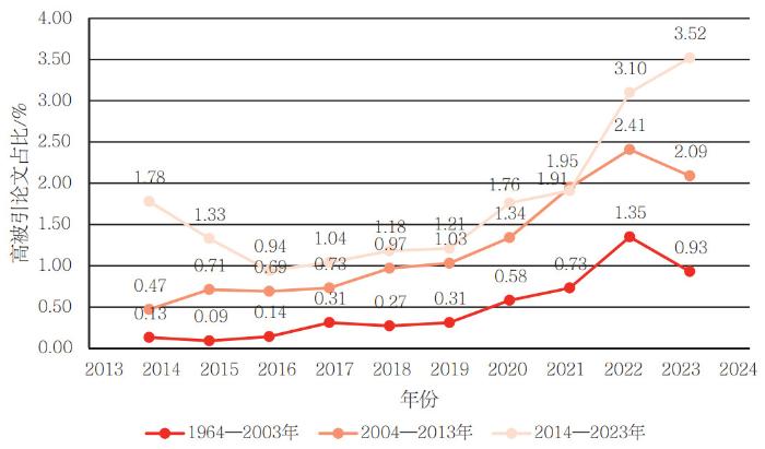 纳入的279种期刊,依据Web of Science数据库收录期刊论文的时间不同进行划分,期刊论文在1964—2003年首次被Web of Science数据库收录的期刊有68种,2004—2013年收录的有110种期刊,2014—2023年收录的有101种期刊。Web of Science数据库收录论文时间不同的期刊的高被引论文占比如图 8所示。论文在2014—2023年首次被Web of Science数据库收录的期刊的高被引论文占比最高,其次是2004—2013年收录的期刊。说明近十年论文首次被Web of Science数据库收录的期刊在高被引论文方面表现良好,近十年来国家对期刊的支持取得了很好的效果。2003年以前收录的期刊,虽然高被引论文占比呈波动式增长趋势,但整体表现不如近二十年收录的期刊。