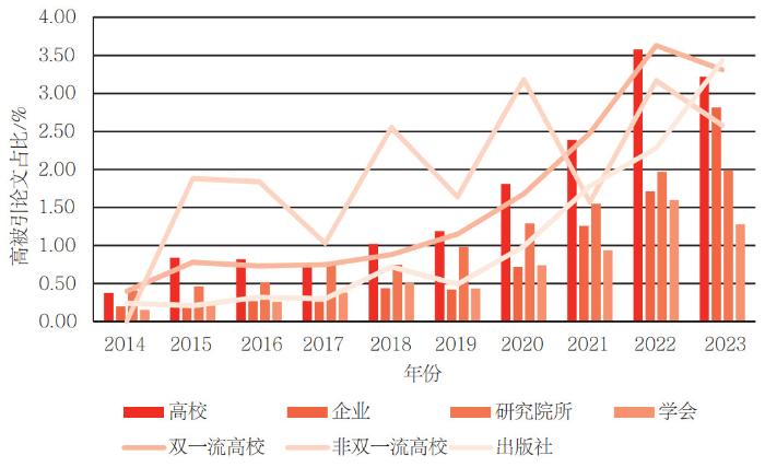 依据期刊的第一主办单位,将期刊主办单位划分为高校、研究院所、学会和企业四类。纳入的279种期刊,高校主办81种,其中双一流高校主办67种,非双一流高校主办14种;研究院所主办94种;学会主办73种;企业主办31种。在企业主办的31种期刊中,有22种期刊为出版社主办。不同主办单位期刊的高被引论文占比如图 9所示。高校主办期刊的高被引论文占比在四种主办单位类型中最高,其中双一流高校主办期刊高被引论文占比2014—2022年呈增长趋势,2019—2022年增长十分明显,2023年有所下降;非双一流高校主办期刊高被引论文占比呈现波动式增长,可能与非双一流高校期刊发文总量少,高被引论文占比不稳定有关。研究院所主办期刊的高被引论文占比仅次于高校,并且2014—2022年呈稳定增长趋势。企业和学会主办期刊的高被引论文占比也呈增长趋势。尤其是出版社主办期刊2019—2023年高被引论文占比呈快速增长趋势,说明集群化期刊的影响力在快速提升。