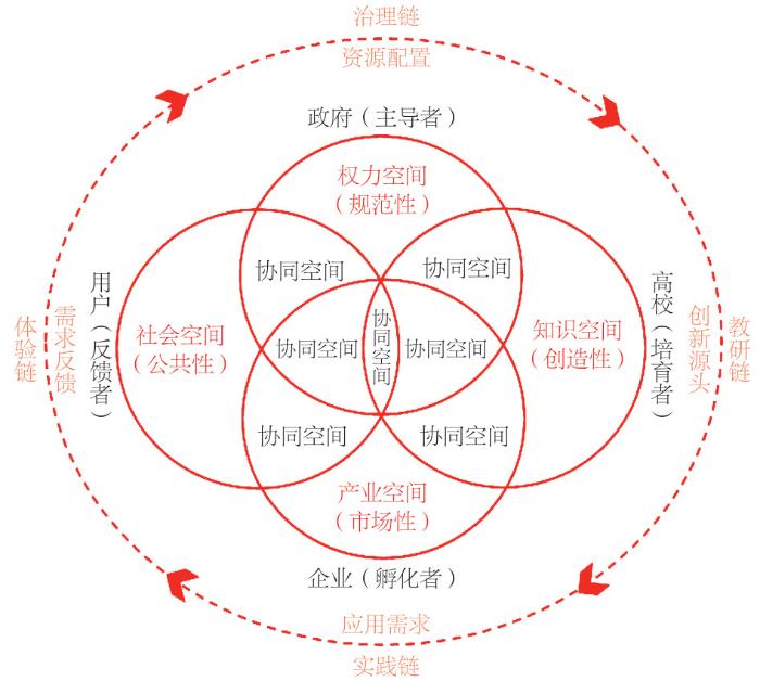 在我国的人才协同培养实践中,四螺旋主体在交互中形成了“政府主导、高校培育、企业孵化、用户反馈”的角色定位,并确立了“治理—教研—实践—体验”的逻辑链条,通过资源配置实现公共治理,以教研为创新源头,以技术为实践载体,以体验为需求归宿,实现了从顶层设计到终端反馈的完整闭环。四螺旋主体与逻辑链条有效链接,重构了以政府为代表的权力空间,以高校为代表的知识空间,以企业为代表的产业空间,以用户为代表的社会空间的四维空间结构,推动主体协同的高质量螺旋式发展。