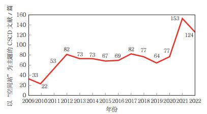由图 1可见,与“空间站”有关的文献,2009—2010年合计不过55篇。受沃尔夫条款影响,我国科学家爱国热情受到激发,坚持自力更生、自主创新道路,踊跃开展相关研究,并将成果发表在国内科技期刊上。2011年迅速攀升至53篇,几乎是前2年文献数量的总和,并且在之后的几年中一直维持在七八十篇左右。2021年,天和核心仓由长征五号火箭成功发射,标志着“天宫空间站”的基本建成,该数据得到爆发性增长,达到153篇。科技期刊为研究、设计、建造空间站的科学家、工程师提供了重要交流平台,为我国“天宫空间站”的建成发挥了重要作用。“天宫空间站”的建成,不仅展示了我国科技自主、自力更生的实力,也对以美国为主导“独霸”国际空间站的格局进行了有力反击,对巩固国家战略安全具有重要意义。
