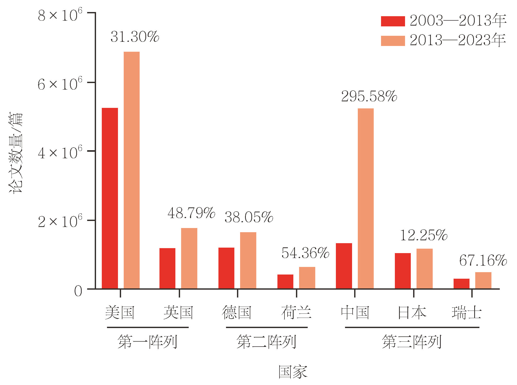 | 图 2 2003—2023年主要出版国家发文总量及增长率变化 |