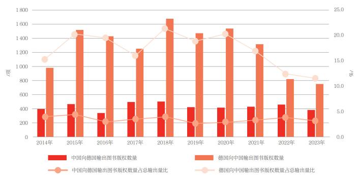 根据德国图书与图书贸易统计报告(Buch und Buchhandel in Zahlen)和中国国家统计局官方网站数据,对2014—2023年中德图书版权贸易情况进行了统计,如图 1所示。从图书版权输出量看,中德两国图书版权发展呈长期稳定态势。2014—2023年,中国向德国年输出图书版权量在350~500项之间,中国是德国图书版权输出量最多的目的地国,德国对华输出图书版权量占各年度总输出量的比例在11%~21%之间。2018年中德双方图书版权贸易达到高峰,中国对德输出图书版权507项,占输出总量的4.0%;德国对华输出图书版权1678项,占输出总量的21.4%。