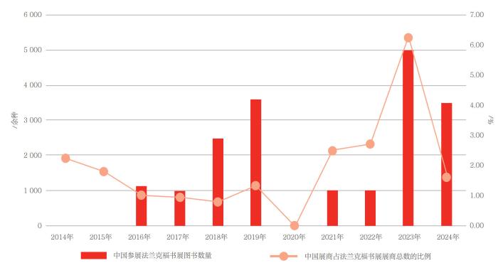 本文以法兰克福书展中国出版业参展情况为例,对2014—2024年相关数据进行了统计,如图 2所示。十余年间,平均每年约有110家中国出版机构参展法兰克福书展,约占展商总量的2%。2023年,线下展会全面恢复,中国参展机构数量大幅增长至263家,达到2009年中国担任法兰克福书展主宾国以来的新高峰,占当年展商总量的6.3%,彰显了中国出版加强国际对话、分享文化成果的积极姿态。在展品层面,自2016年起中国每年携逾千种图书赴德,2019年参展图书达3602种(4457册),2023、2024年分别达到5000余种和3500余种,为世界打开了观察中国文化发展的窗口。与此同时,德国出版界对中国市场的兴趣与参与日益加深。据德国图书信息中心(北京)和中国图书进出口(集团)有限公司国际会展中心调研反馈,德国是BIBF重要的国际展商来源国。近年来,德国国家展团吸引60余家机构参与BIBF,其中既有弗里德里希学术出版社(Academic Publishing House Friedrich Mauke LP)、以设计和生活美学见长的柏林设计出版社(Gestalten)、专注儿童科普的泰斯洛芙出版社(Tessloff Verlag)等知名出版机构,也有丁香出版等专业版权代理公司,以及德国少儿出版联合会(Arbeitsgemeinschaft von Jugendbuchverlagen e.V.)等行业协会。