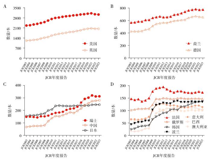 JCR2023共收录全球82个国家或地区的SCIE期刊9 486种,全球SCIE期刊呈现区域分布不均、发展不均衡,且两极分化严重的特点。根据期刊绝对数量可将SCIE期刊主要出版国家大致划分为几大规模阵列:第一阵列为SCIE期刊数量超过2 000种的美国、英国,占世界总SCIE期刊数量的53.50%;第二阵列为SCIE期刊数量超过600种的荷兰、德国,占总量的15.06%;第三阵列为SCIE期刊数量超过200种的瑞士、中国(大陆)、日本,占总量的8.86%;第四阵列为SCIE期刊数量超过100种的7个国家(法国、俄罗斯、韩国、波兰、意大利、巴西、澳大利亚),占总量的9.59%;第五阵列为SCIE期刊数量为1~99种的其他68个国家,占总量的12.99%。进一步分析JCR2003—JCR2023共21年数据,显示主要出版国家SCIE期刊数量均有不同程度增加,如图 1所示。其中,第一阵列国家和第二阵列国家的期刊绝对数量逐年增多。第三阵列国家中瑞士和中国的期刊数量增加明显,日本自JCR2011之后期刊数量维持相对稳定。第四阵列中的大多数国家的期刊数量在JCR2008—JCR2011期间有明显增长,之后维持相对稳定;澳大利亚的期刊数量在JCR2010期间显著增长后快速回落,并保持稳定;仅韩国的期刊数量保持持续增加的趋势。