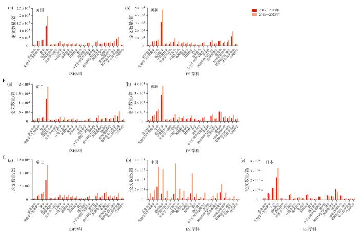 InCites数据库中,以作者单位所属“国家”为检索关键词,数据集选择“InCites Dataset”,组织数据库对象选择“Essential Science Indicators”,时间范围选择“2003—2013”“2013—2023”,检索SCIE期刊上发表的论文数量、学科分类等信息,统计总发文量和逐年发文量。