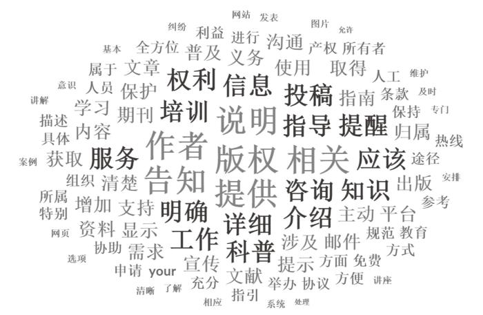根据开放科学环境下科研人员版权认知的实证数据和质性分析,借助NVivo软件绘制的词云图,如图 1所示,清晰地揭示了“培训”“科普”与“咨询”等关键词的显著地位。鉴于此,笔者以提升科研人员的版权意识与管理能力为主线,致力于构建一个多层次、精准化、协同联动的版权素养提升与保护体系,制定实施了一系列工作举措,并提出后续发展建议。