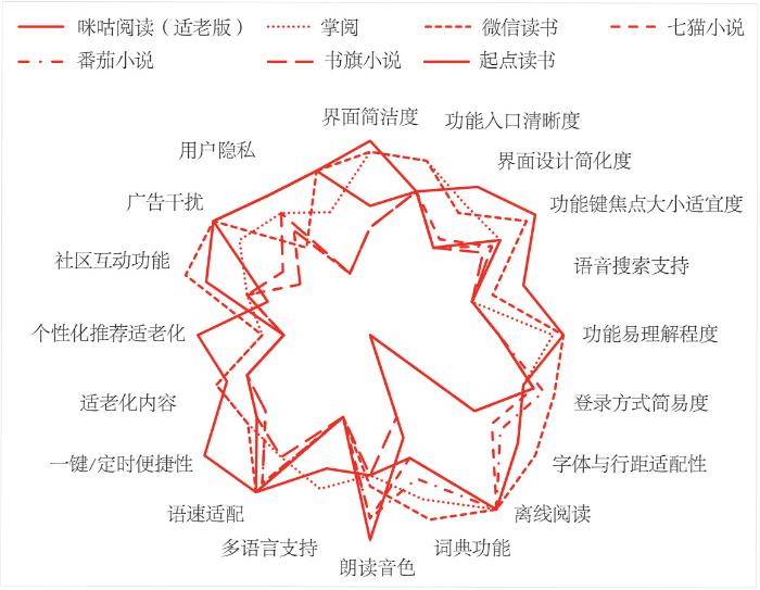 在界面设计方面,咪咕阅读、七猫免费小说、番茄免费小说与微信读书等数字阅读平台支持文字与图标的放大;掌阅、起点读书和书旗小说在设计优化方面仍显不足。在听书功能方面,七猫免费小说、番茄免费小说、起点读书和微信读书采用AI情感语音,听感更自然;咪咕阅读、掌阅和书旗小说为较为机械的合成音。掌阅和咪咕阅读支持方言朗读,其余平台均没有此功能。在操作便利性上,只有咪咕阅读支持语音搜索,其他平台尚未配备。触控操作上,咪咕阅读、微信读书、七猫免费小说、番茄免费小说和掌阅表现较好,起点读书和书旗小说则有待改进。在内容适配方面,咪咕阅读构建了适合老年群体的专题内容,其他平台则以泛用户内容为主,缺乏针对性。在社交功能上,微信读书具备较强的社交互动功能。在安全性方面,咪咕阅读和微信读书提供无广告的清爽阅读体验,而其余5个平台存在广告干扰问题。总体来看,咪咕阅读和微信读书在适老化设计上较为突出,其余平台仍需加强功能优化与内容适配,以更好满足老年用户需求(见图 1)。