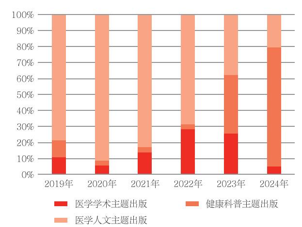 对三类卫生健康主题出版的码洋结构分析显示,医学人文主题出版在市场具有明显领先优势,六年间平均码洋比重为67.88%,其中2020年受抗疫人文叙事类主题出版拉动,占比高达91.25%,随后逐年回落至2024年的20.80%。健康科普主题出版码洋比重自2023年以来显著增长,2024年以74.07%的码洋占比跃居市场首位。医学学术主题出版六年间平均码洋比重为12.96%,2024年降至5.13%。由此可见,市场需求已从初期的应急性人文叙事逐步转向常态化健康知识服务,进而驱动三类卫生健康主题出版的市场结构调整(见图 3)。