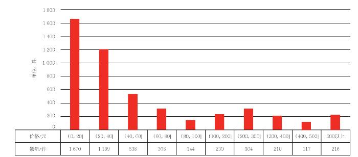 以京东平台为例,截至2025年4月28日,在京东平台上以“安静书”为关键词进行检索,可检索到接近500个相关品牌,在剔除了缺失值、最高值和最小值后,对京东平台上4 936件安静书商品进行统计,发现价格在0~20元区间内的安静书商品数量最多,共有1 670件;其次是20~40元区间的安静书,共有1 199件;300元以上的安静书较为稀缺,总共有543件,以一套标价837元的布艺类安静书为例,该套书共有14册,主题分为农场、鲨鱼、太空、海洋、公主、马戏、衣饰等,目标读者年龄为1~6岁。安静书商品价格分布如图 1所示,目前安静书市场中低端消费是主流,高端消费较为稀缺。