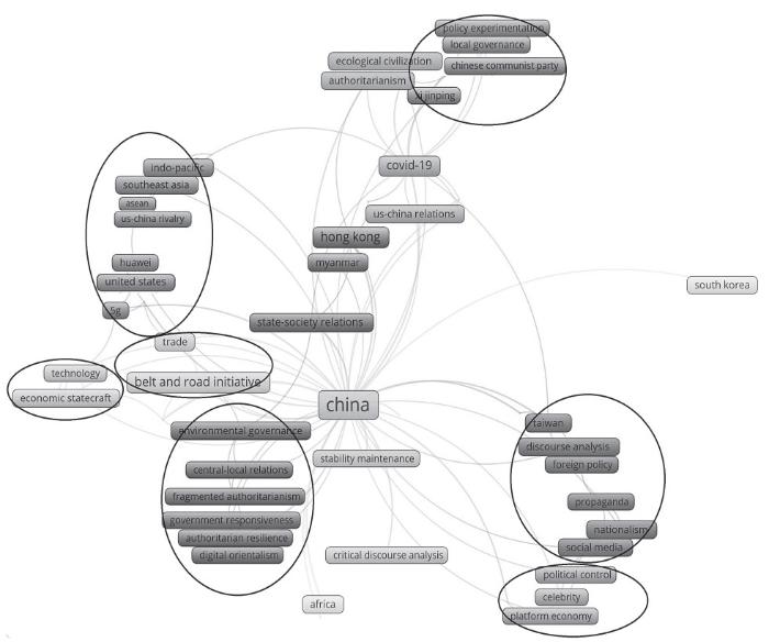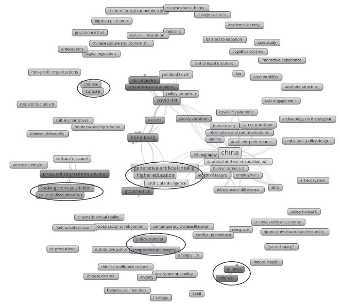 Vosviewer基于一定的算法集中显示聚焦于同一主题的关键词,详见图谱中画圈的关键词主题群。可以看出,国际TOP文章的关键词主题群丰富、明显且集中。而中国期刊文章的关键词主题群偏少,且关键词间的连线不多、主题分散,575个关键词中仅有35个的出现频次在2次及以上。这虽然体现出中国期刊文章从多个研究维度展现了我国的发展实践,但议题的显著性往往需要通过媒介的集中关注和频繁讨论来实现。这种离散性客观上导致研究视角碎片化,弱化了核心议题的显示度,使话语共识凝聚乏力,难以塑造显著、统一的国家形象认知。例如,中国期刊虽零星涉及“一带一路”倡议,但由于相关文献较少,未能在该议题上形成议题显著性,从而制约了受众对议题的认知理解。