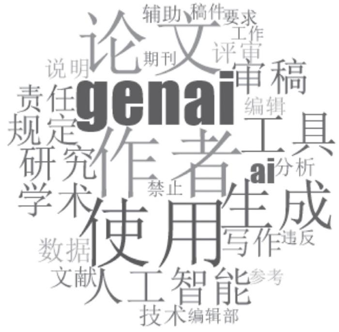 利用Nvivo 12 Plus对40份政策文本进行词频分析,为有效筛选不必要重复的词语,设置词频条件为出现频次最高的30个去“同义词”,将“内容”“进行”“情况”“用于”等词纳入“停用词库”,并将显示最小长度调整为“2”,生成图 1所示词云图及表 1所示高频词统计表。发现“作者”“人工智能”“AI”“论文”等词语在40份AI政策文本中出现的频率最高。由于Nvivo12 Plus软件没有手动添加同义词的功能,所以研究团队将表 1中的近义词“GenAI”“人工智能”和“AI”合并为“AI”,得出其出现的频次最高达916次。其中“作者”“论文”“AI”“审稿”等第一类(排名前10)高频词表明,AI政策主要围绕作者和审稿人在论文撰写与审稿过程中对使用AI工具的行为进行规范。“写作”“责任”“评审”“文献”“编辑”“辅助”等第二类(排名11至20)高频词充分体现了科技期刊将学术生产全流程中的责任归属和使用规范作为AI政策文本的重要部分。“禁止”“稿件”“参考”“期刊”“编辑部”等第三类(排名21至30)高频词说明现有的AI政策注重规范禁止使用范围,以及进一步明确编辑部、期刊单位的审查和处理机制。综合第一、第二和第三类高频词可知,现有AI政策的关注点是在规范作者和审稿人使用AI工具行为的同时,明确各方责任,以确保学术出版的真实性、原创性与合规性。